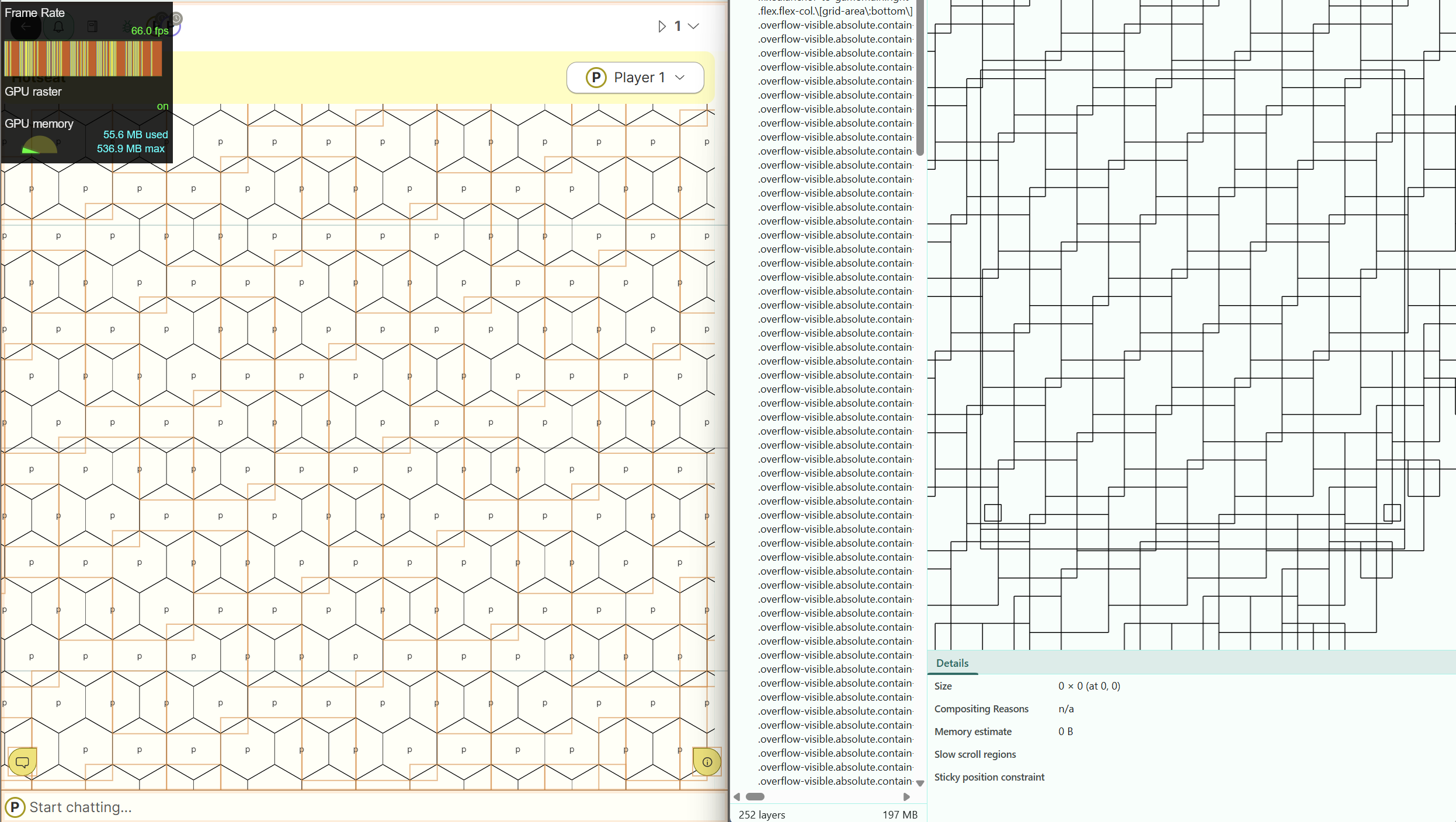 Above: the hex grid on the left shows orange layer borders around every cell. On the right is another browser dev tool, the layer view, which confirms we have 252 individual layers.