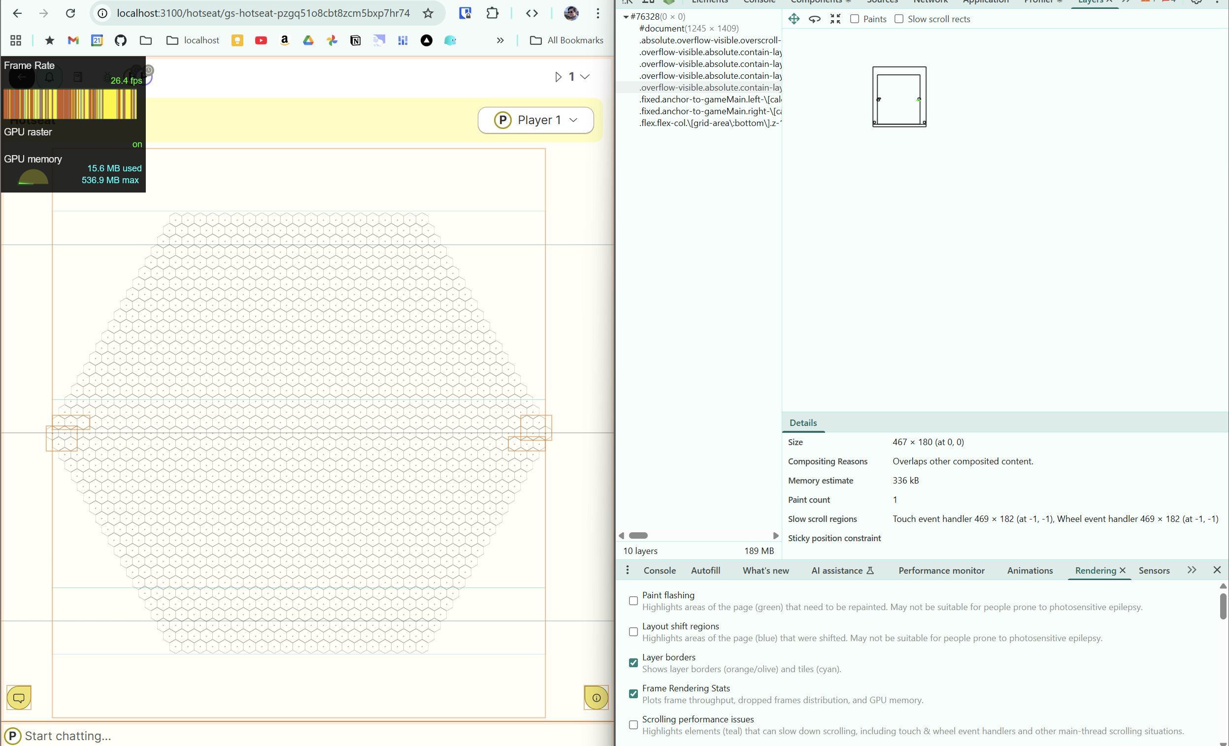 So we know the problem: overlapping elements get pushed to their own layer, and every hex in a hex grid overlaps other elements. And browsers provide no explicit way of circumventing this.
