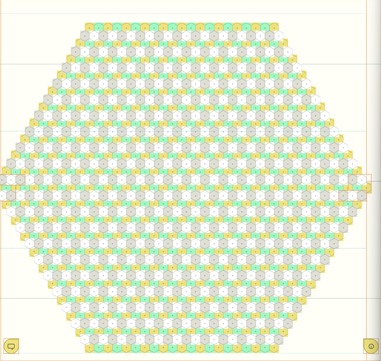 Theoretically you could do this by splitting into two groups, the odd and even rows. This ought to work as hexes on the same row butt up flat against one another without overlapping. But something about Chrome's layer algorithm trips up on this too. So I've opted for a two-tiered separation: every other cell from every other row.